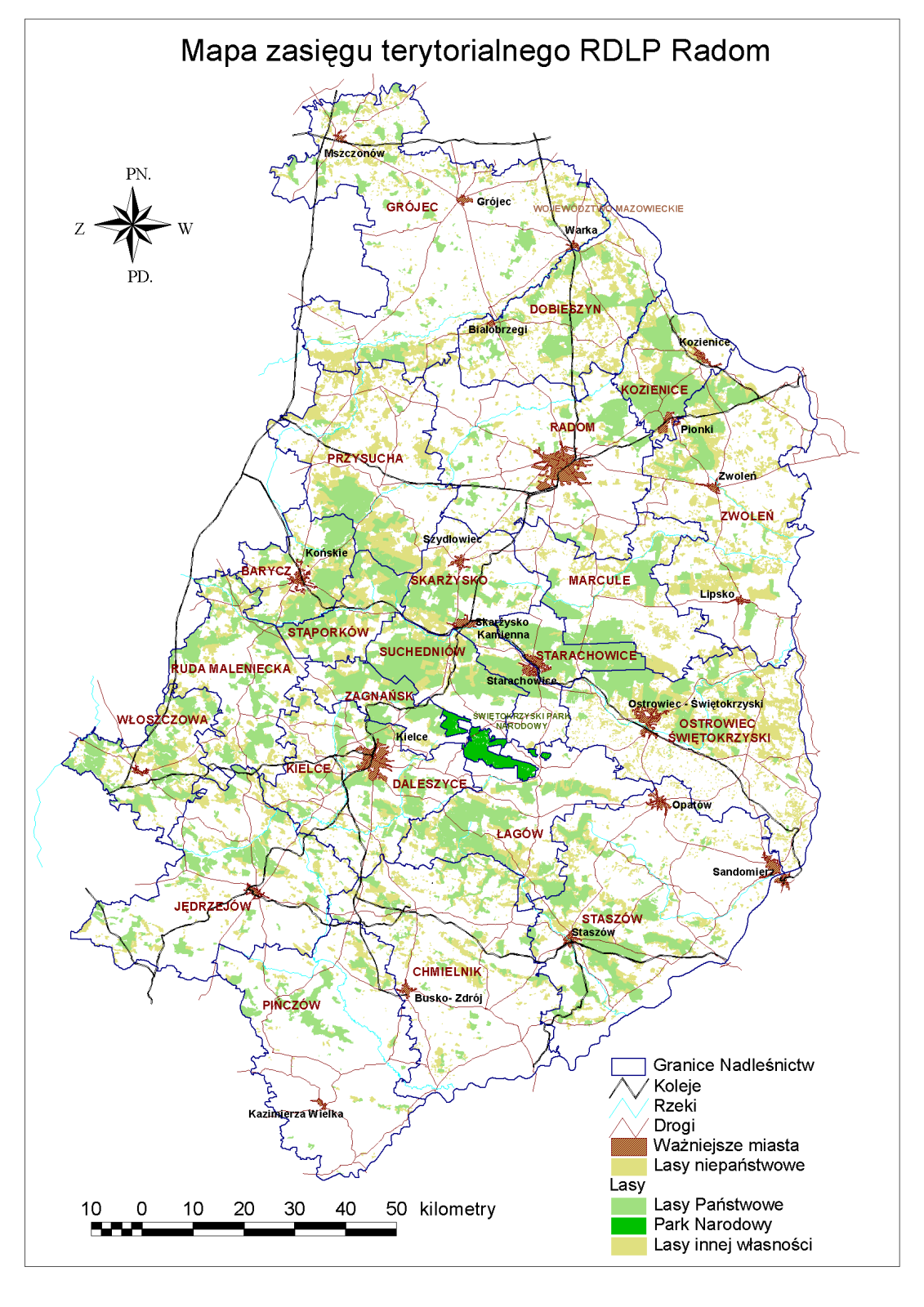Lasy Regionalnej Dyrekcji Lasów Państwowych w Radomiu zajmują 324,5 tys. ha i są bardzo zróżnicowane, podobnie jak lesistość tego terenu. Wiele z nich przetrwało dawne osadnictwo i nadal tworzy zwarte leśne obszary. Puszcza Świętokrzyska i Kozienicka należą do najcenniejszych obszarów przyrodniczych w kraju. Inne wyróżniające się kompleksy leśne to Puszcza Stromiecka, Lasy Iłżeckie oraz lasy Niecki Włoszczowskiej. Pozostałe lasy: okolic Chmielnika, Staszowa, Pińczowa, Jędrzejowa i Grójca są bardziej rozdrobnione, ale także cenne i mające swoją specyfikę.