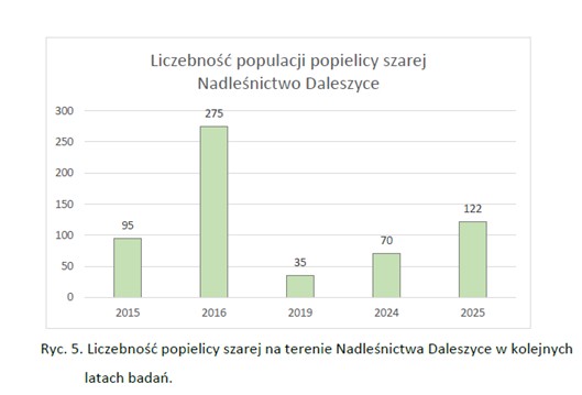 - populacja popielicy szarej liczyła 122 osobniki (51 dorosłych i 71 młodocianych),