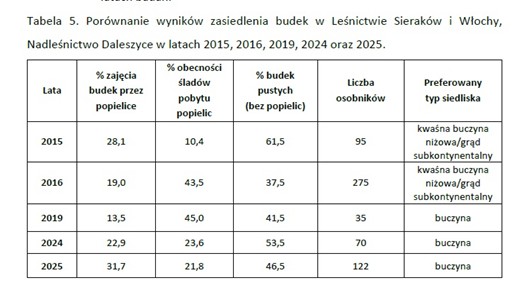 - obecność innych gatunków stwierdzono w 31 budkach, w tym: ptaki – 26 przypadków, gniazda os, szerszeni lub mrówek – 3 przypadki, nietoperze – 2 przypadki,