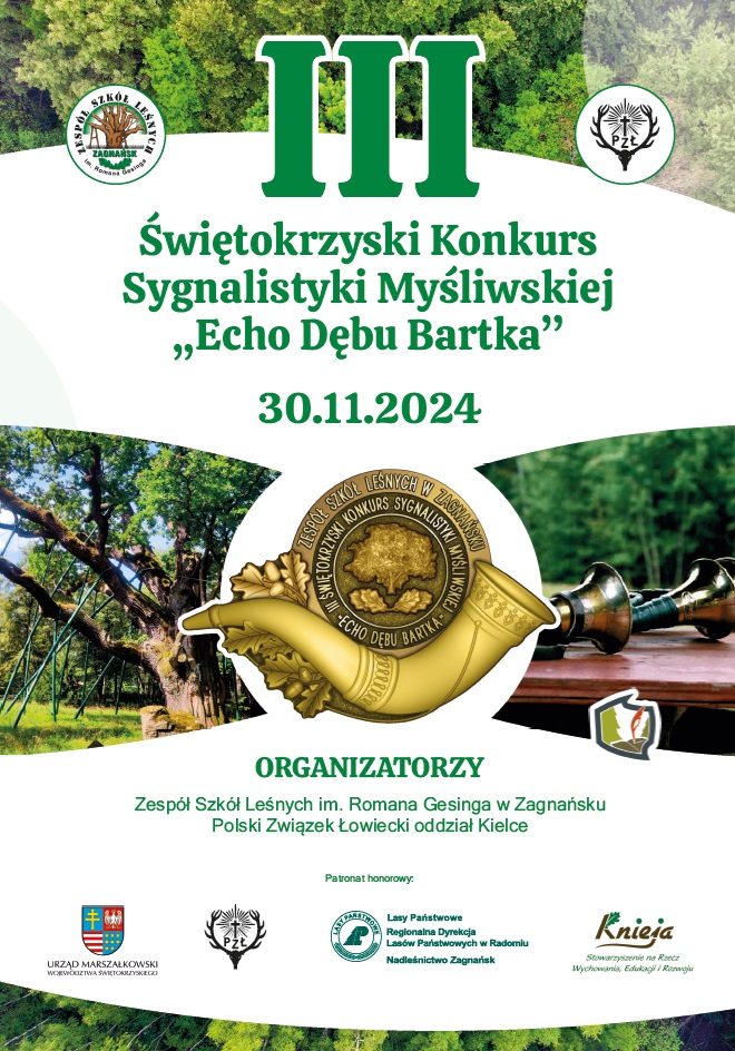 30 listopada 2024 r. w auli Zespołu Szkół Leśnych w Zagnańsku odbędzie się III Świętokrzyski Konkurs Sygnalistyki Myśliwskiej „Echo Dębu Bartka” organizowany przez Zespół Szkół Leśnych im. Romana Gesinga w Zagnańsku. Współorganizatorem wydarzenia jest RDLP w Radomiu oraz Nadleśnictwo Zagnańsk.